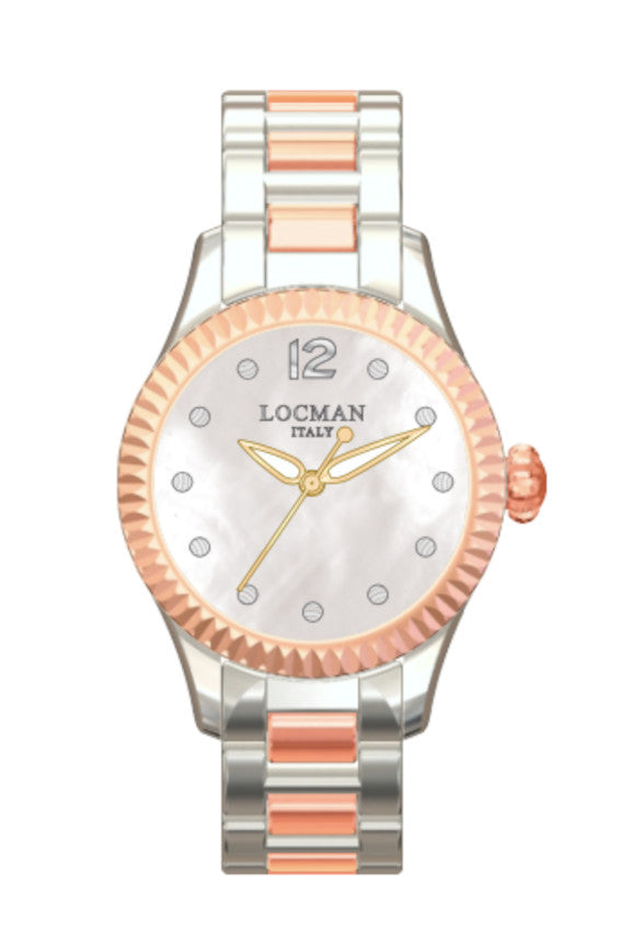three hands quartz round 30mm stainless steel and titanium pvd rose gold with mop white dial and stainless steel band