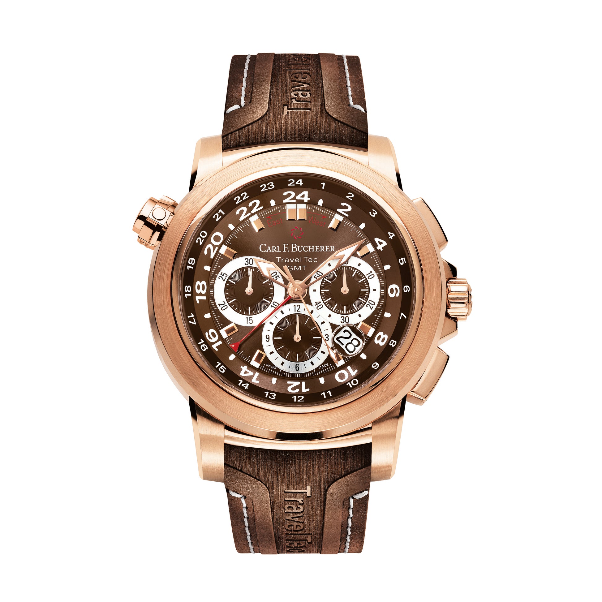 Automatic rose gold 47mm, power reserve 42 hours, cosc-certified chronometer, chronograph, three time zones, date, hour, minute, second with stainless steel, screw-down crown, sapphire crystal with anti reflective coating on both sides, water resistance: to 50m (5atm) on brown rubber strap with stainless steel folding clasp with comfort extension
