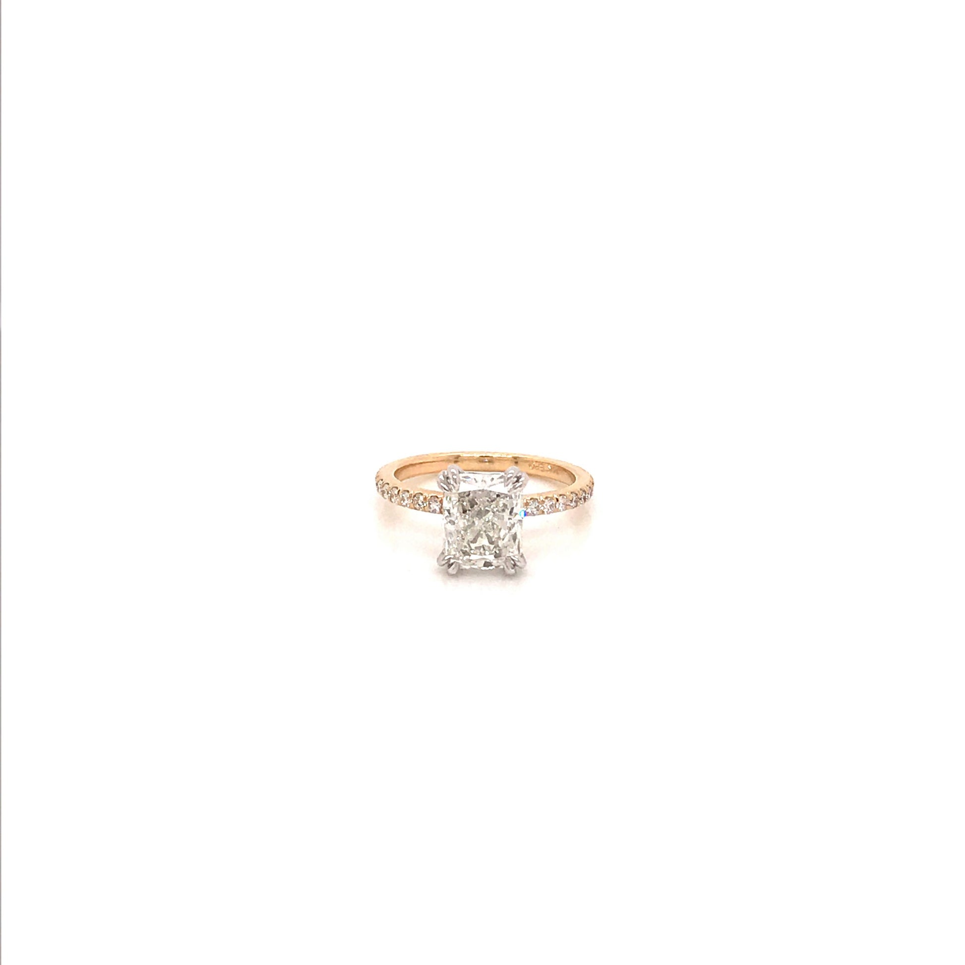 14k Yellow Gold micropave diamond setting with white gold four prong head, holding Radiant Diamond.