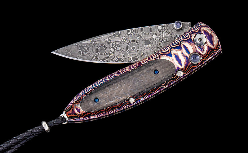 META- INLAID WITH CARBON FIBER SCALES. BLADE "RAINDROP" DAMASCUS. LOCK AND THUMB STUD SET WITH IOLITE GEMSTONES.