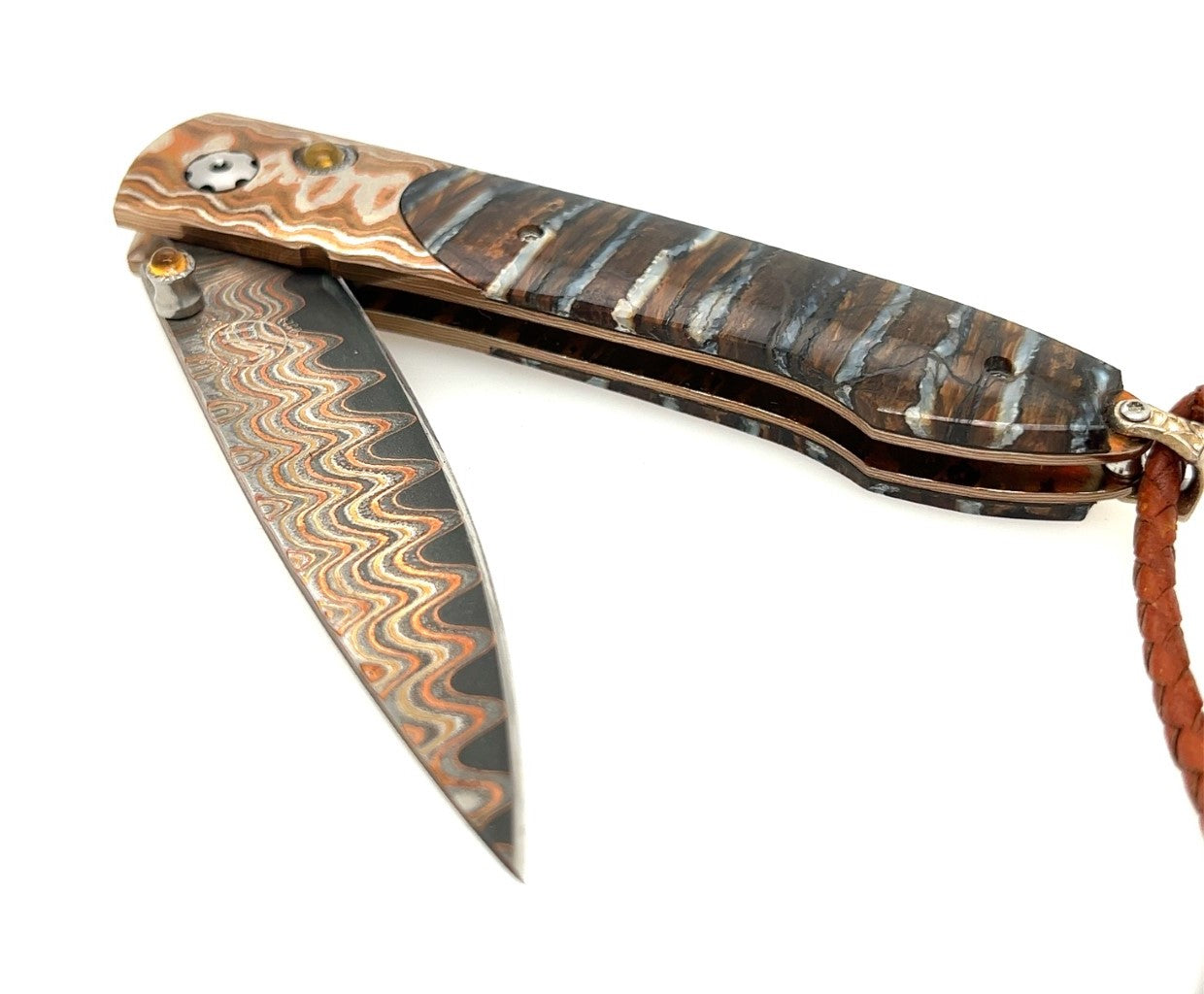INSTINCT - FRAME HEAT-COLORED "WAVE MOKUME" INLAID WITH 10,000 YEAR OLD WOOLY MAMMOTH TOOTH. KNIFE IS DAMASCUS STEEL WITH ONE HAND BUTTON LOCK IN CITRINE GEMSTONES.