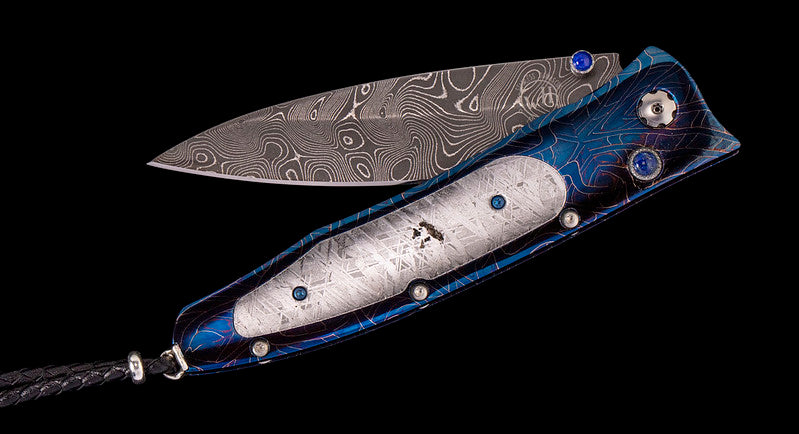 SHOOTING STAR - FEATURES ALLURING FRAM OF HEAT-BLUED, HAND FORGED "BRAIN WAVE" DAMASCUS WITH INLAID METEORITE. BLADE IS HAND FORGED "BOOMERANG" DAMASCUS WITH LAPIS THUMB STUD GEMS.