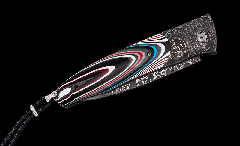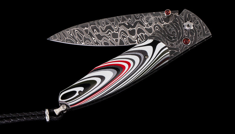 BIG BLOCK - hand forged "Rolling Rock" damascus with inlaid FORDITE (aka Motor City Agate). Blade is hand forged "Intrepid" damascus steel. Button Lock and thumb stud set with red garnet gemstones.