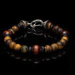 DRAGON FIRE 11 -BEADED BRACELET FEATURES TIGER EYE BEADS SUPPORTED BY FROSTED BLACK ONYX WITH SILVER CLASP