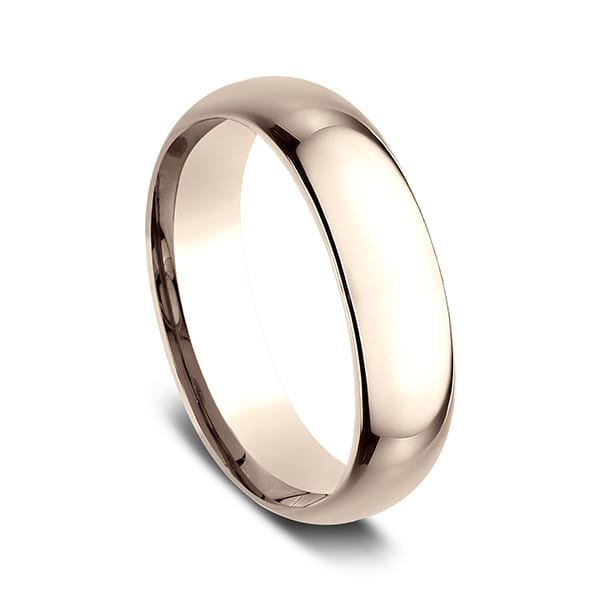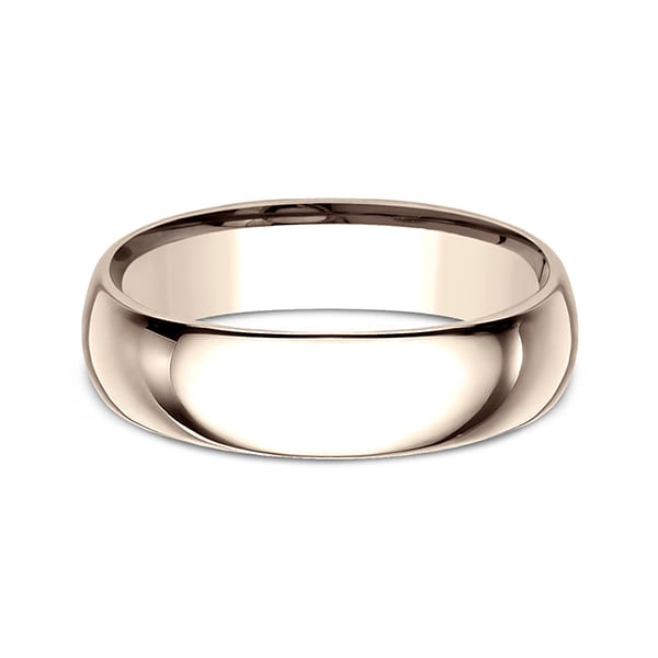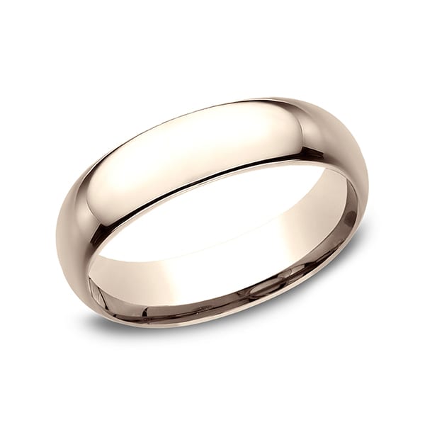 This beautiful 14 karat rose gold 6mm wedding band features a slightly domed surface and comfort-fit on the inside for unforgettable comfort. Benchmark has been manufacturing designer wedding rings in gold platinum and palladium for over 40 years. Made in the USA using 100% recycled materials you can feel good about choosing Benchmark wedding bands.
