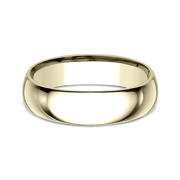 This beautiful 14 karat yellow gold 6mm wedding band features a slightly domed surface and comfort-fit on the inside for unforgettable comfort. Benchmark has been manufacturing designer wedding rings in gold platinum and palladium for over 40 years. Made in the USA using 100% recycled materials you can feel good about choosing Benchmark wedding bands.