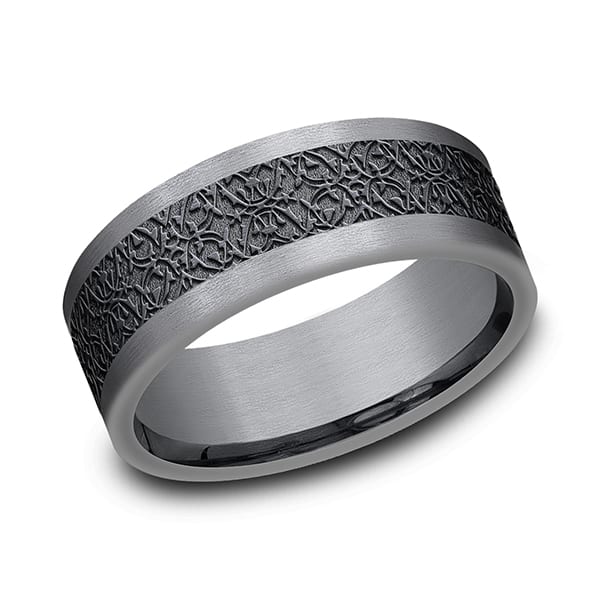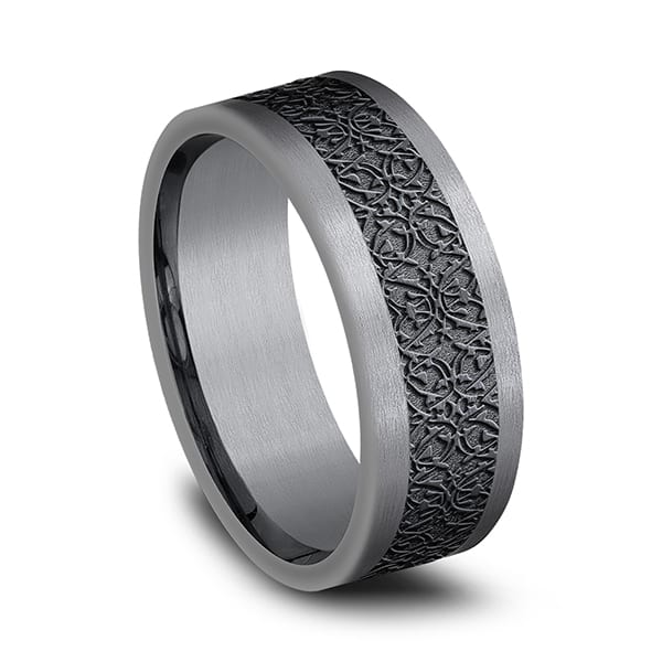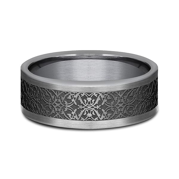 Inspired by Ottoman patterns this grey tantalum design band features an exquisite black titanium pattern inlay that sets your style apart from traditional ring fashion. Our newest concept in contemporary wedding rings is our tantalum wedding bands. Made in the USA our tantalum wedding bands are hypo-allergenic impervious to breakage and corrosion and easy to remove in an emergency. Using proprietary technology to create unique design and construction our tantalum mens wedding bands are beautiful works of art.