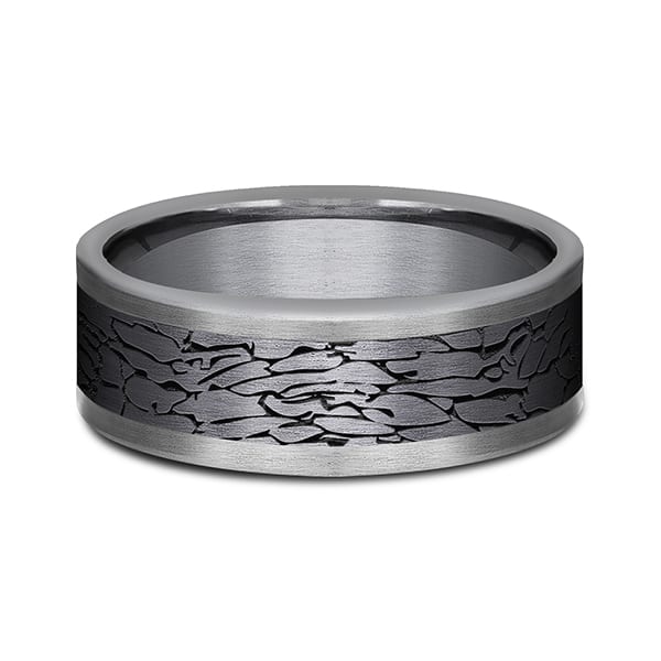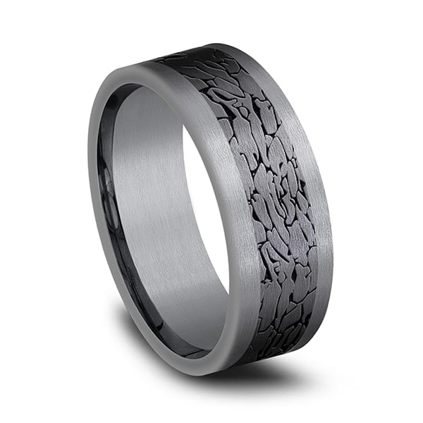 The fractured rock look of the grey tantalum inlay accented by black titanium high polished edges is a show stopper. Our newest concept in contemporary wedding rings is our tantalum wedding bands. Made in the USA our tantalum wedding bands are hypo-allergenic impervious to breakage and corrosion and easy to remove in an emergency. Using proprietary technology to create unique design and construction our tantalum mens wedding bands are beautiful works of art.