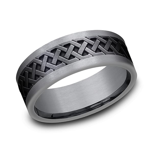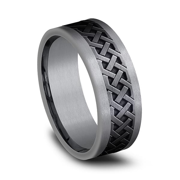 Representing the timeless nature of love this 8mm grey tantalum and black titanium design band features an endless Celtic Knot pattern. Our newest concept in contemporary wedding rings is our tantalum wedding bands. Made in the USA our tantalum wedding bands are hypo-allergenic impervious to breakage and corrosion and easy to remove in an emergency. Using proprietary technology to create unique design and construction our tantalum mens wedding bands are beautiful works of art.