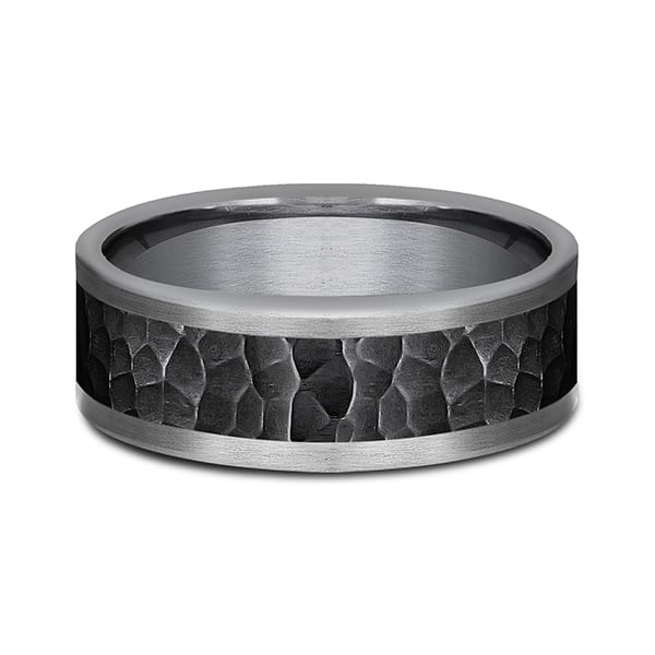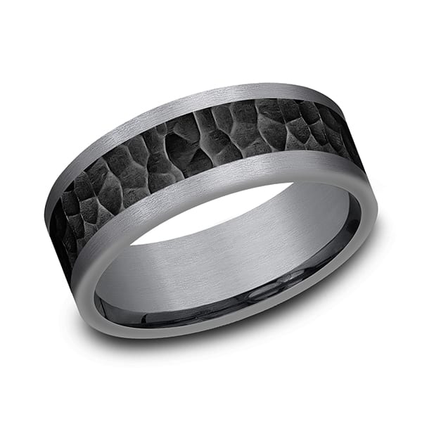 This black titanium and grey tantalum design band places a new emphasis on modern style featuring a hammered-finish. Our newest concept in contemporary wedding rings is our tantalum wedding bands. Made in the USA our tantalum wedding bands are hypo-allergenic impervious to breakage and corrosion and easy to remove in an emergency. Using proprietary technology to create unique design and construction our tantalum mens wedding bands are beautiful works of art.