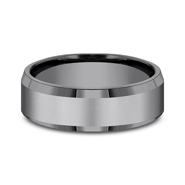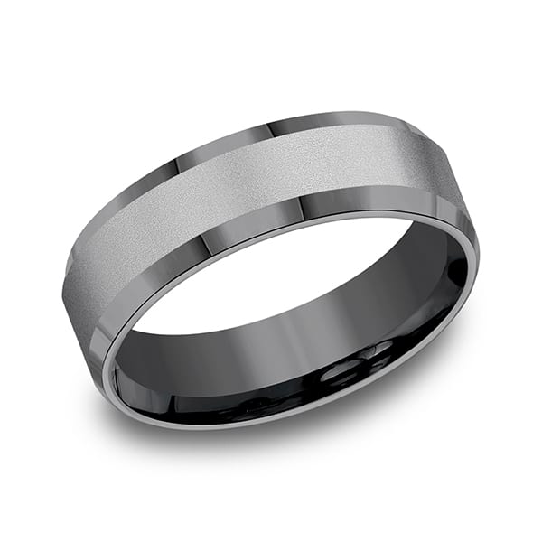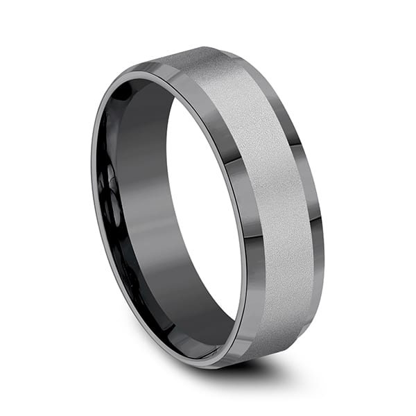 This cool and modern 7mm comfort-fit tantalum wedding band features a clean satin center framed by high polish beveled edges. Our newest concept in contemporary wedding rings is our tantalum wedding bands. Made in the USA our tantalum wedding bands are hypo-allergenic impervious to breakage and corrosion and easy to remove in an emergency. Using proprietary technology to create unique design and construction our tantalum mens wedding bands are beautiful works of art.