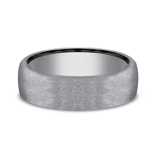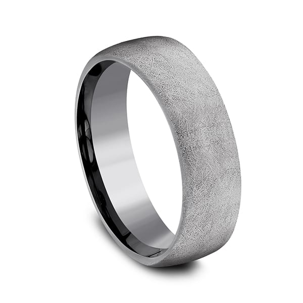 Beautifully distressed this 6.5mm comfort-fit Tantalum wedding band features an eye-catching swirl finish. Our newest concept in contemporary wedding rings is our Tantalum wedding bands. Made in the USA our Tantalum wedding bands are hypo-allergenic impervious to breakage and corrosion and easy to remove in an emergency. Using proprietary technology to create unique design and construction our Tantalum mens wedding bands are beautiful works of art.
