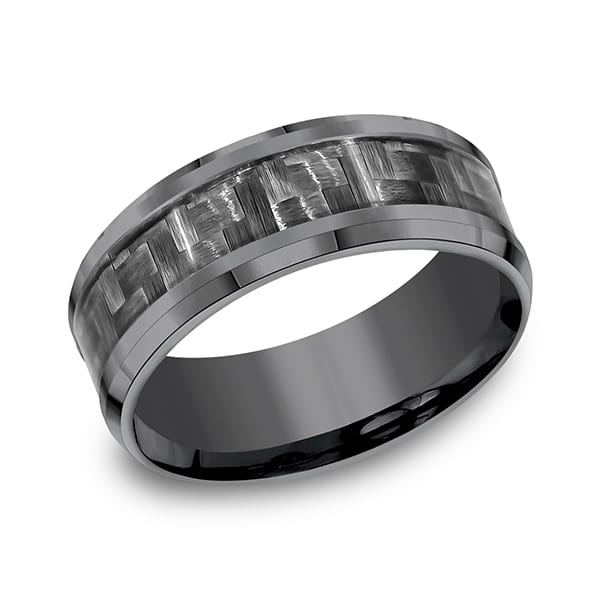 This modern and edgy 8mm Tantalum design wedding band features a unique carbon fiber center. Our newest concept in contemporary wedding rings is our Tantalum wedding bands. Made in the USA our Tantalum wedding bands are hypo-allergenic impervious to breakage and corrosion and easy to remove in an emergency. Using proprietary technology to create unique design and construction our Tantalum mens wedding bands are beautiful works of art.