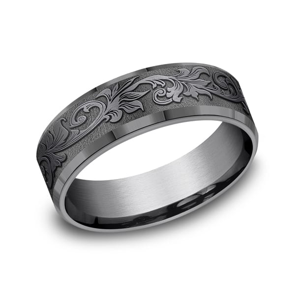 This vintage inspired 7mm comfort-fit Tantalum wedding ring features a floral script detail. The newest concept in contemporary wedding rings is our Tantalum wedding bands. Made in the USA our Tantalum rings are hypo-allergenic impervious to breakage and corrosion and easy to remove in an emergency. Using proprietary technology to create unique design and construction our Tantalum mens wedding bands are beautiful works of art.