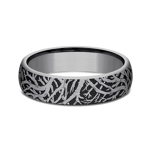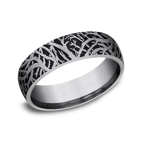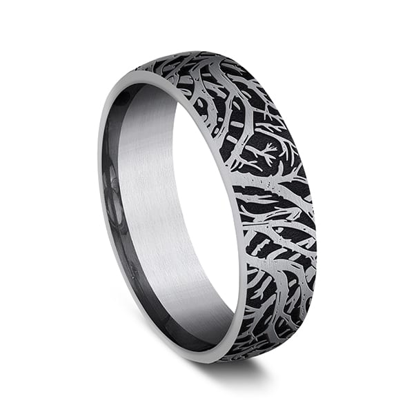 Wear resistant black detailing on the Enchanted Forest motif adds a dimensional feel to this 6mm tantalum band. The newest concept in contemporary wedding rings is our tantalum wedding bands. Made in the USA our tantalum rings are hypo-allergenic impervious to breakage and corrosion and easy to remove in an emergency. Using proprietary technology to create unique design and construction our tantalum mens wedding bands are beautiful works of art.