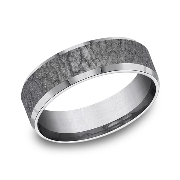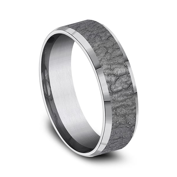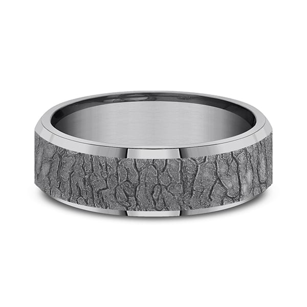 Inspired by the Dogwood tree this 7mm tantalum ring features a bark motif highlighted by slight high polish beveled edges. The newest concept in contemporary wedding rings is our tantalum wedding bands. Made in the USA our tantalum rings are hypo-allergenic impervious to breakage and corrosion and easy to remove in an emergency. Using proprietary technology to create unique design and construction our tantalum mens wedding bands are beautiful works of art.