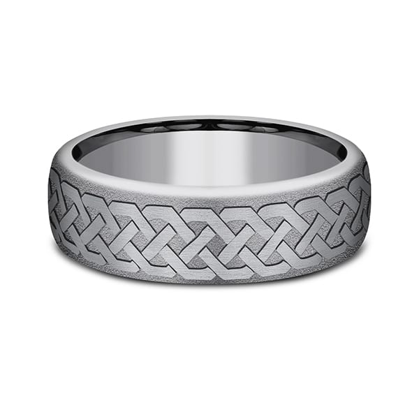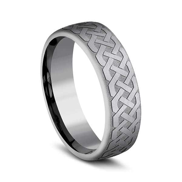 Representing the timeless nature of love this 6.5mm tantalum band features an endless Celtic Knot pattern. The newest concept in contemporary wedding rings is our tantalum wedding bands. Made in the USA our tantalum rings are hypo-allergenic impervious to breakage and corrosion and easy to remove in an emergency. Using proprietary technology to create unique design and construction our tantalum mens wedding bands are beautiful works of art.