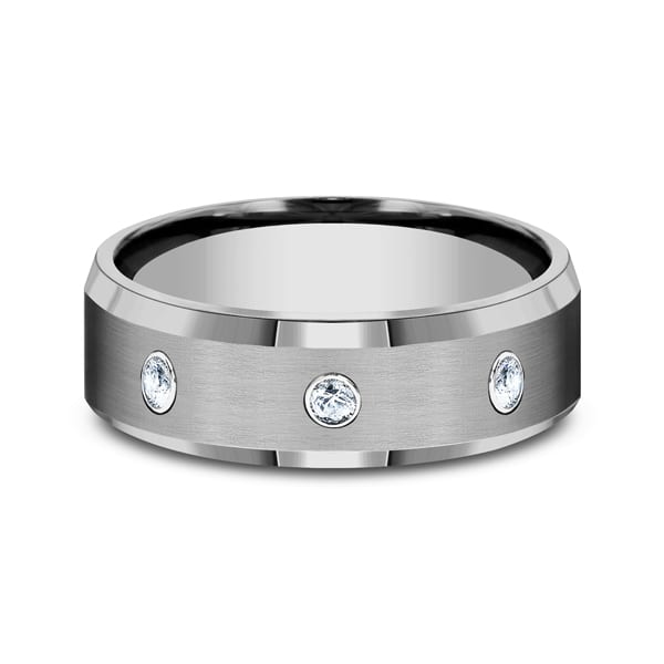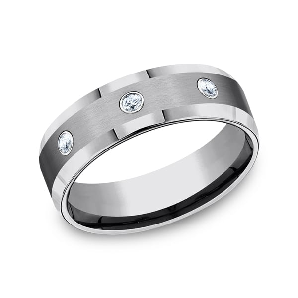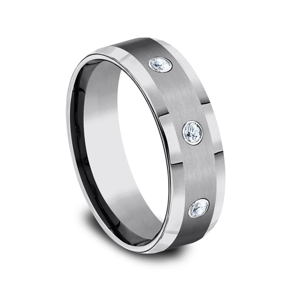 This incredible 7mm comfort-fit tungsten wedding band features high polished edges with three round ideal cut stones set along a satin finish center. Forge by Benchmark offers contemporary wedding rings in cobalt, titanium, Damascus Steel and tungsten. Some of our most durable and rugged wedding bands for men, our Forge line of wedding rings are sure to last a lifetime.