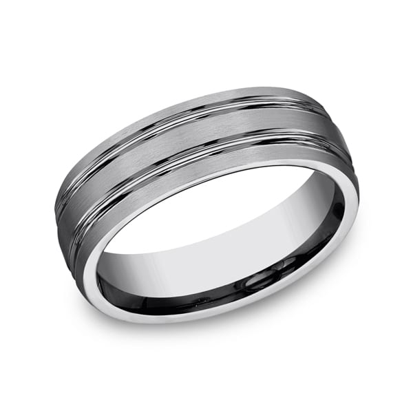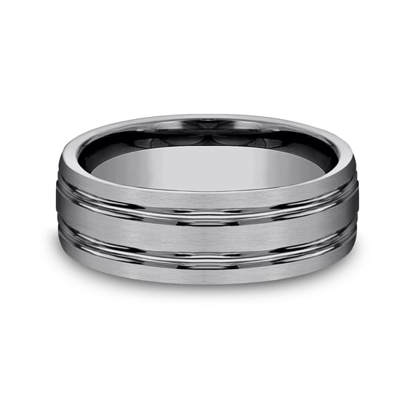 This satin finish 7mm comfort-fit tungsten wedding band features two parallel high polished grooves along the center for remarkable style. Forge by Benchmark offers contemporary wedding rings in cobalt, titanium, Damascus Steel and tungsten. Some of our most durable and rugged wedding bands for men, our Forge line of wedding rings are sure to last a lifetime.