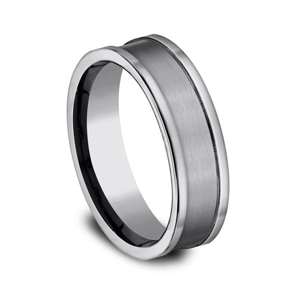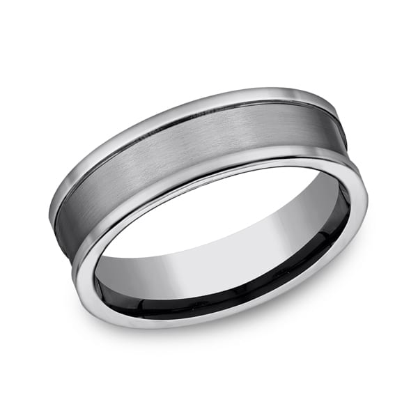 This awesome 7mm concaved tungsten wedding band features a satin finish center with polished edges and a comfort-fit on the inside. Forge by Benchmark offers contemporary wedding rings in cobalt, titanium, Damascus Steel and tungsten. Some of our most durable and rugged wedding bands for men, our Forge line of wedding rings are sure to last a lifetime.