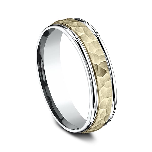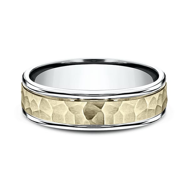 This incredible two-toned 6mm carved design band features a hammered-finished yellow center along the high polished white edge. Benchmark has been manufacturing designer wedding rings in gold platinum and palladium for over 40 years. Made in the USA using 100% recycled materials you can feel good about choosing Benchmark wedding bands.