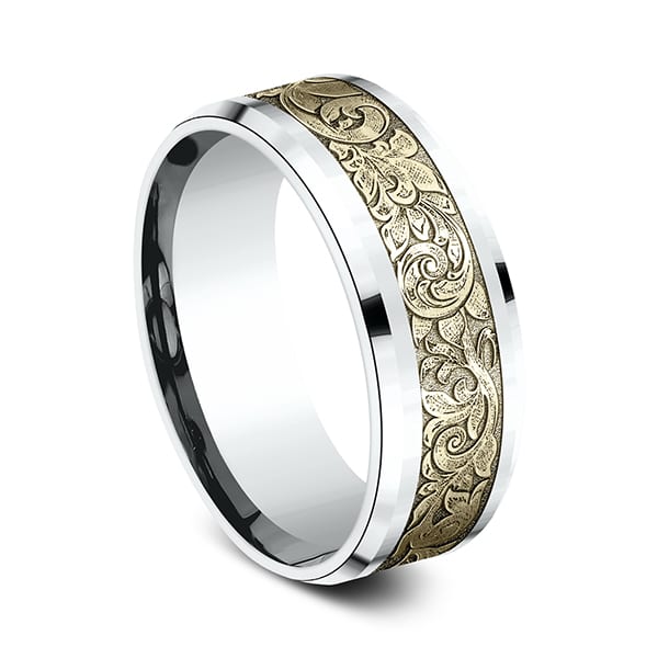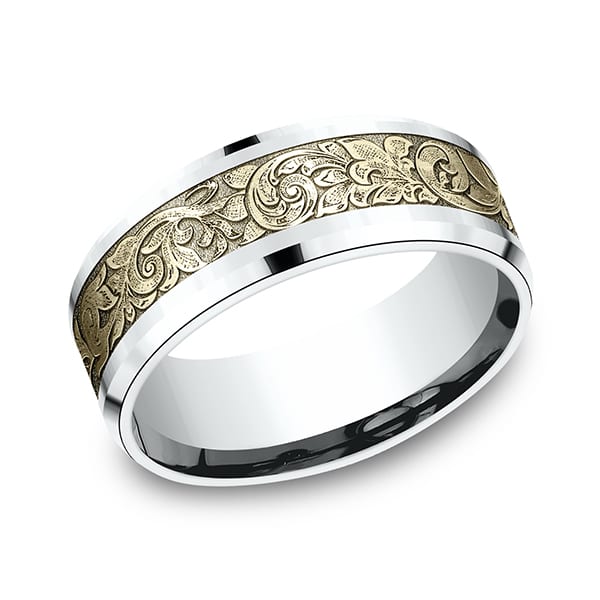 The floral script on this 8mm comfort-fit two-tone design ring channels the vintage feel of the Victorian era. Benchmark has been manufacturing designer wedding rings in gold platinum and palladium for over 40 years. Made in the USA using 100% recycled materials you can feel good about choosing Benchmark wedding bands.