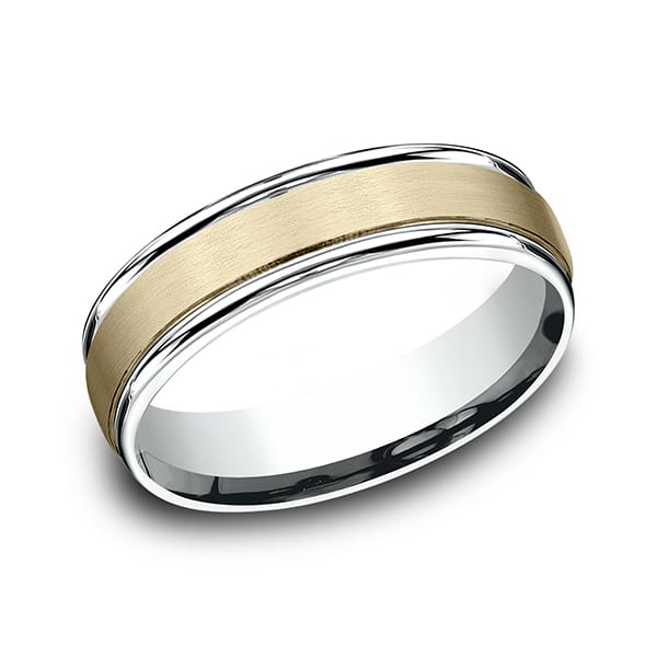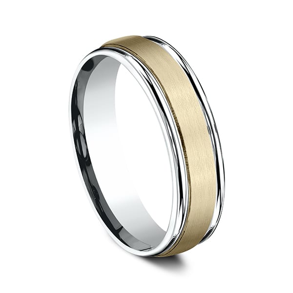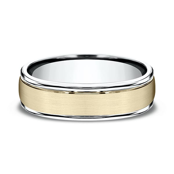 Classically handsome this 6mm two-tone 14 karat white and yellow gold sculpted wedding band's satin finish center is framed by high polish edges. Benchmark has been manufacturing designer wedding rings in gold platinum and palladium for over 40 years. Made in the USA using 100% recycled materials you can feel good about choosing Benchmark wedding bands.