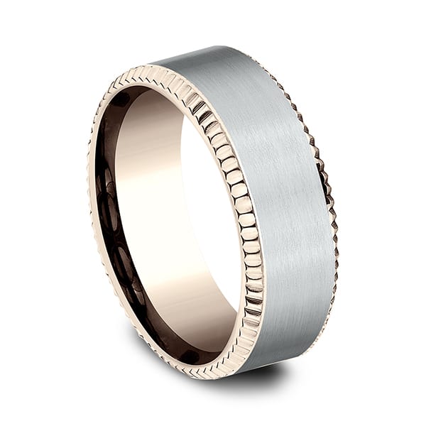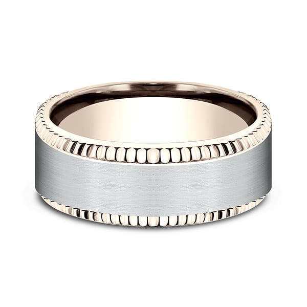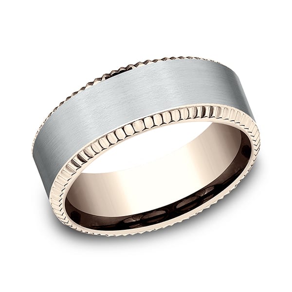 With a look that is both sleek and industrial this 8mm rose gold design band features a white gold satin inlay. Benchmark has been manufacturing designer wedding rings in gold platinum and palladium for over 40 years. Made in the USA using 100% recycled materials you can feel good about choosing Benchmark wedding bands.
