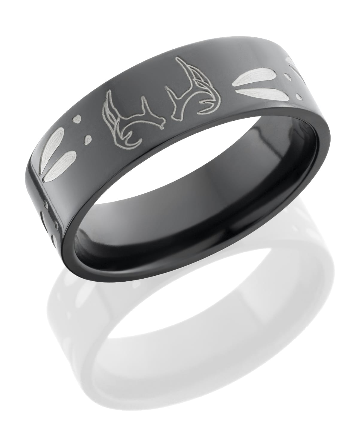 Zirconium 8mm flat band with 1 antler and deer tracks circling the band