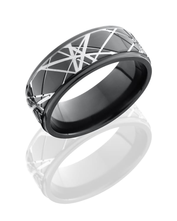 Zirconium 8mm Flat Band with Grooved Edges and Retro Pattern