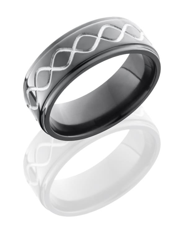 Zirconium 8mm Flat Band with Grooved Edges and Infinity Pattern