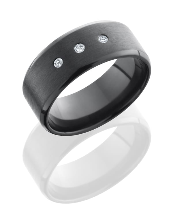 Zirconium 9mm Beveled Band with 3 Flush Set 03ct White Round Diamonds