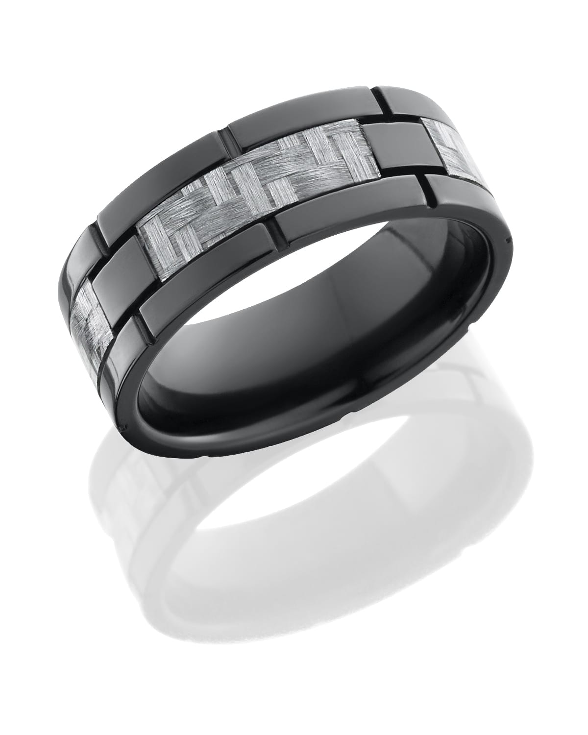 Zirconium 8mm flat band with 4 segments of Silver Carbon Fiber
