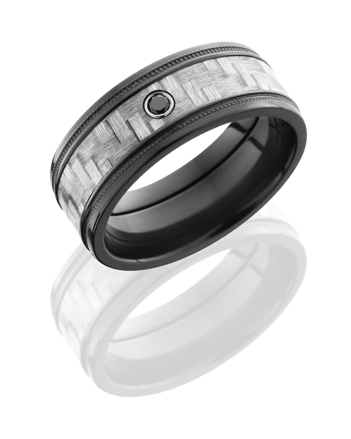 Zirconium 9mm Flat Band with 5mm of Silver Carbon Fiber, Grooved Edges and Bezel-set .05 Black Round Diamond